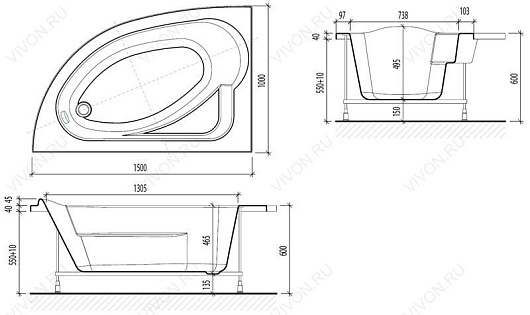 - Фронтальная панель, слив-перелив, ручки, подголовник, система гидромассажа и аэромассажа приобретаются отдельно