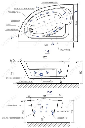 - Фронтальная панель, слив-перелив, ручки, подголовник, система гидромассажа и аэромассажа приобретаются отдельно