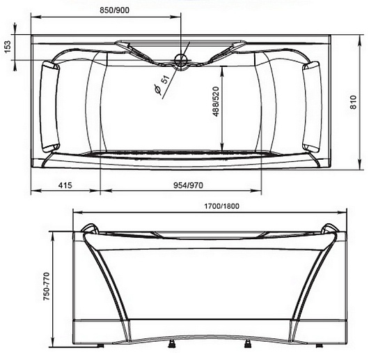 В комплекте: ванна, фронтальная панель, каркас, подголовник (2 шт.).