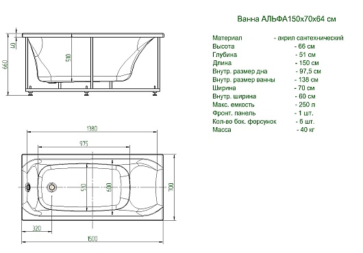 Комплектация: ванна, каркас, слив-перелив, фронтальный экран.