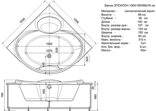 Комплектация: ванна, каркас, фронтальный экран, слив-перелив.