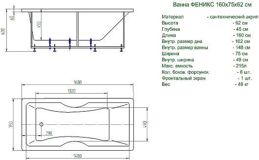 Комплектация: ванна, каркас, фронтальный экран, слив-перелив.
