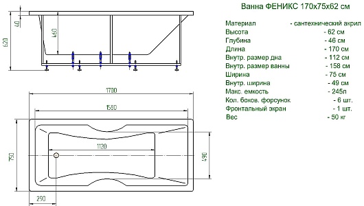 Комплектация: ванна, каркас, фронтальный экран, слив-перелив.