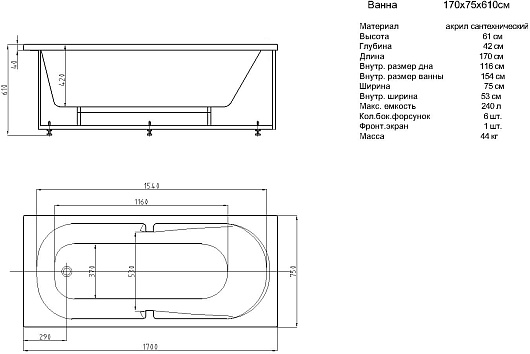 Комплектация: ванна, каркас, фронтальная панель, слив-перелив.