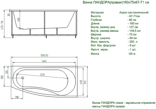 Акриловая ванна Aquatek Пандора 160x75 R - арт. PAN160-0000039.