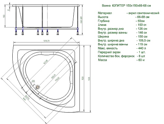 Акриловая ванна Aquatek Юпитер 150x150 с экраном - арт. UPT150-0000026.