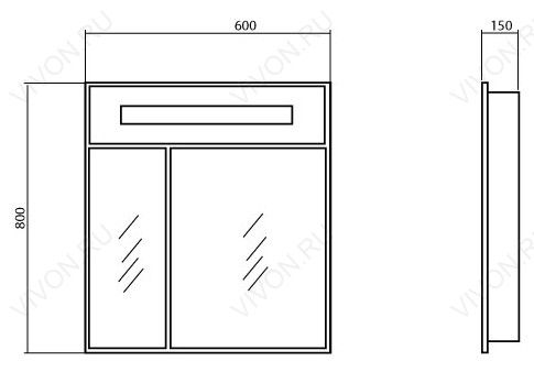 Комплектация: две распашных дверцы из влагостойкого зеркального 3-мм полотна (Бельгия), внутреннее отделение с двумя вкладными полками. Зеркало имеет встроенную в верхнюю панель подсветку.