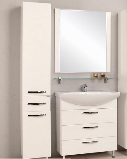 Комплектация: три выдвижных ящика с шариковыми направляющими, в верхнем ящике расположена система хранения. Корпус из глянцевого ЛДСП, фасады — МДФ (глянец), хромированая фурнитура, фаянсовая раковина "Смайл 80".