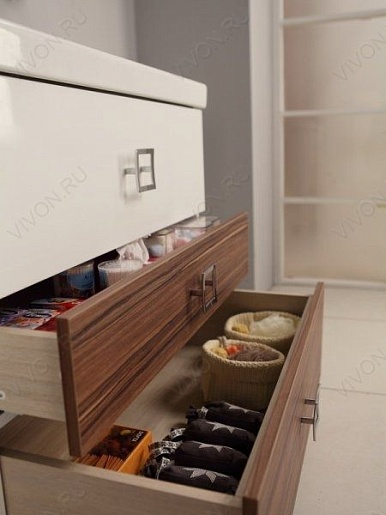Комплектация: Деревянные ящики на направляющих с системой плавного закрывания -3шт, ручка-3, навесы-2, ножка-4, раковина.