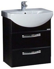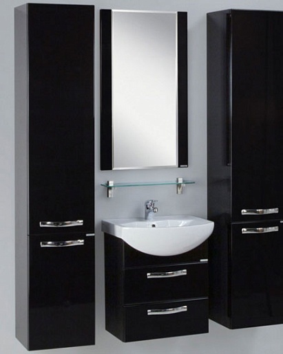 Комплектация: два выдвижных ящика с шариковыми направляющими, в верхнем ящике расположена система хранения. Корпус из глянцевого ЛДСП, фасады — МДФ (глянец), хромированая фурнитура, фаянсовая раковина "Смайл 50". Усиленные навесы входят в комплект.