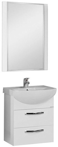 Комплектация: два выдвижных ящика с шариковыми направляющими, в верхнем ящике расположена система хранения. Корпус из глянцевого ЛДСП, фасады — МДФ (глянец), хромированая фурнитура, фаянсовая раковина "Смайл 50". Усиленные навесы входят в комплект.