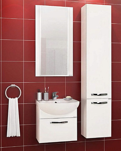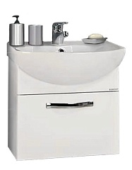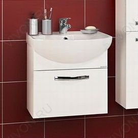 Комплектация: глубокий выдвижной ящик с системой хранения. Корпус из глянцевого ЛДСП, фасады — МДФ (глянец), хромированая фурнитура, фаянсовая раковина "Смайл 50". Усиленные навесы входят в комплект.