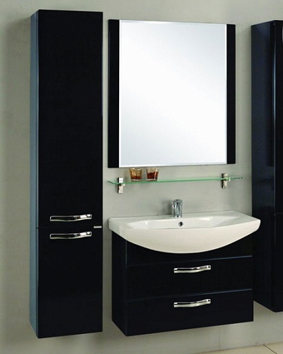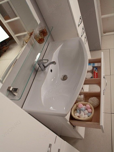 Комплектация: два выдвижных ящика, верхний из которых оборудован удобной системой хранения. Корпус из глянцевого ЛДСП, фасады — МДФ (глянец), хромированая фурнитура, фаянсовая раковина "Смайл 80". Усиленные навесы и механизм полного выдвижения для ящиков входят в комплект.