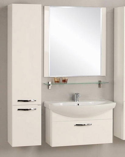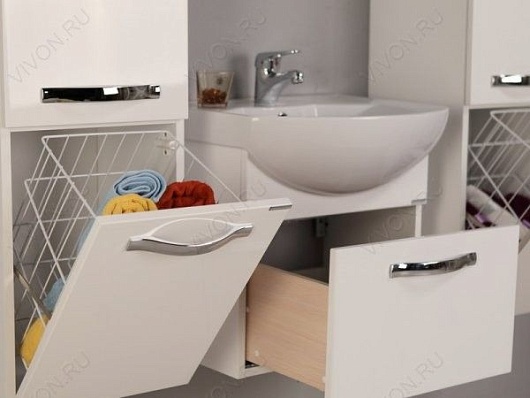 Комплектация: глубокий выдвижной ящик с системой хранения. Корпус из глянцевого ЛДСП, фасады — МДФ (глянец), хромированая фурнитура, фаянсовая раковина "Смайл 80". Усиленные навесы входят в комплект.
