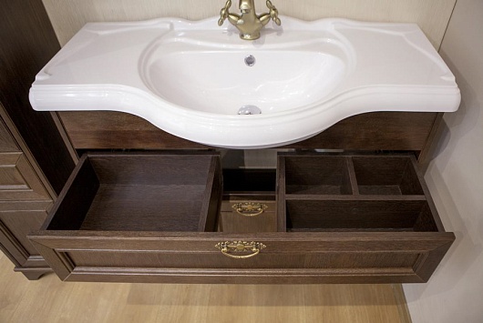 - тумба под раковину: распашные дверцы с доводчиками, выдвижной ящик с органайзером, внутренние полки, ручки от итальянского производителя BOSETI MORELLA