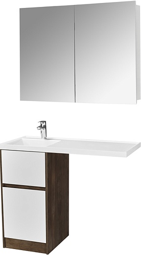 Комплектация: тумба (корпус), фасад (2 шт.), раковина, зеркальный шкаф, крепления.