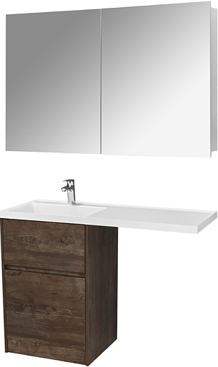 Комплектация: тумба (корпус), фасад (2 шт.), раковина, зеркальный шкаф, крепления.