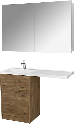 Комплектация: тумба (корпус), фасад (2 шт.), раковина, зеркальный шкаф, крепления.