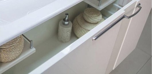 Комплектация: усиленный подвесной кронштейн - 2, ручка - 1, ящик на направляющих плавного закрывания - 1, раковина "Тина 1000" арт. 1A710431TI010.