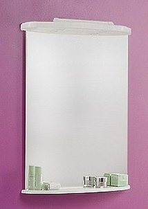 Комплектация: влагостойкое зеркальное полотно с полочкой. В карниз встроены два галогеновых светильника с автономным выключателем и розетка.