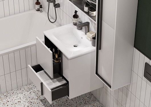 - Верхний ящик тумбы оснащен нажимной системой открывания Push-to-open.