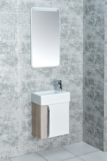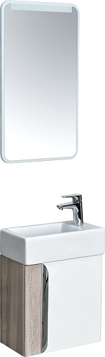 Тумба с раковиной Акватон Вита 45 - арт. 1A221401VTD70 / 1WH301972 - практичное и функциональное решение для небольших ванных комнат и санузлов, которое отличается сочетанием эффектного белого глянца и стильной отделки под дерево ясень шимо. Фасады и корпус тумбы выполнены из влагостойкой ЛДСП. Распашной фасад-створка открывается с помощью вертикально установленной ручки и оборудован петлями с интегрированной системой плавного закрывания, благодаря чему эксплуатация тумбы становится практически бесшумной.