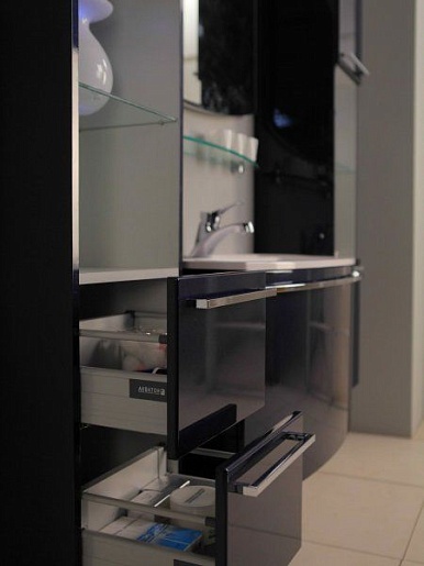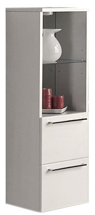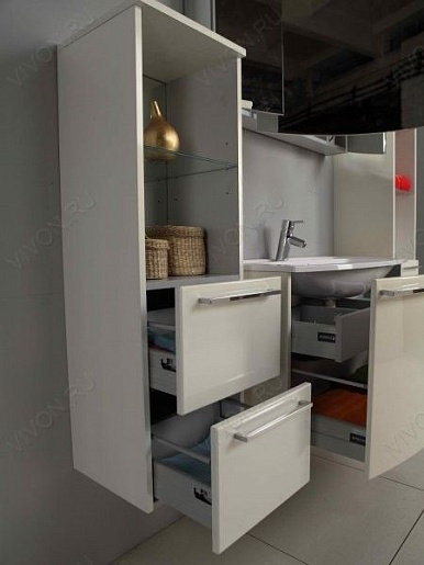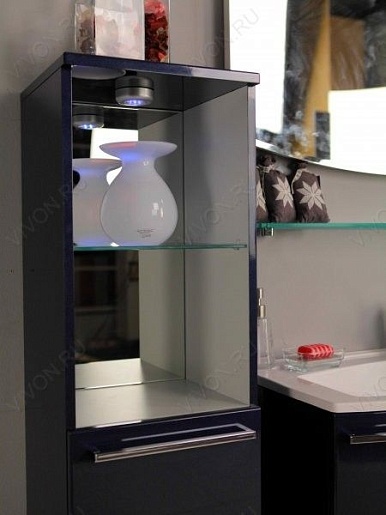 Описание: подвесная полуколонна для ванной комнаты. Два закрытых двустенных ящика, над ними открытая ниша со стеклянной, регулируемой по высоте полочкой и светодиодным светильником. Фасады из MDF с пятислойной глянцевой покраской, корпус — ЛДСП с трехслойной покраской.