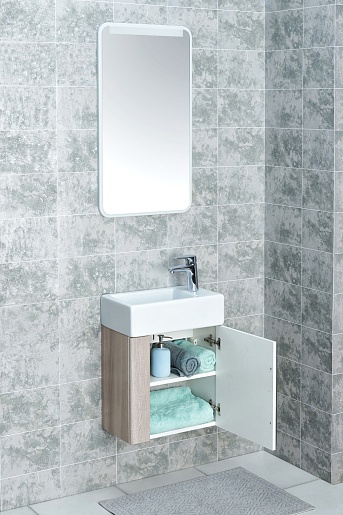 Тумба под раковину Акватон Вита 45 - арт. 1A221401VTD70 - практичное и функциональное решение для небольших ванных комнат и санузлов, которое отличается сочетанием эффектного белого глянца и стильной отделки под дерево ясень шимо. Фасады и корпус тумбы выполнены из влагостойкой ЛДСП. Распашной фасад-створка открывается с помощью вертикально установленной ручки и оборудован петлями с интегрированной системой плавного закрывания, благодаря чему эксплуатация тумбы становится практически бесшумной.
