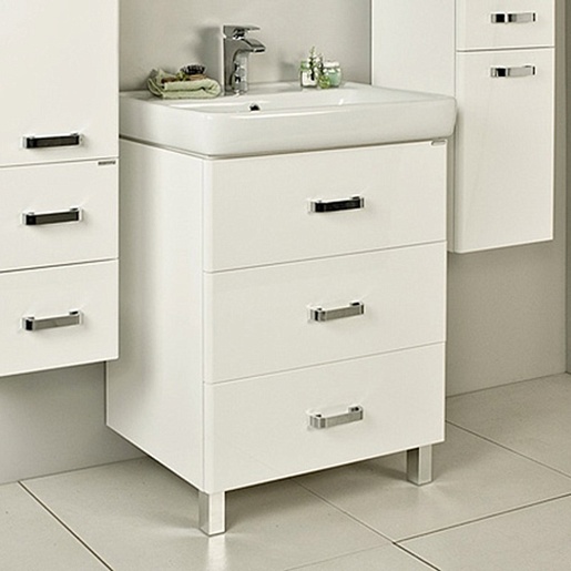 Комплектация: крепления, опорные ножки, доводчики, ручка – 3, ящики на направляющих – 3, раковина "Тигода" 60см (арт. 1WH302082). Средняя нагрузка на ящик - 25 кг.