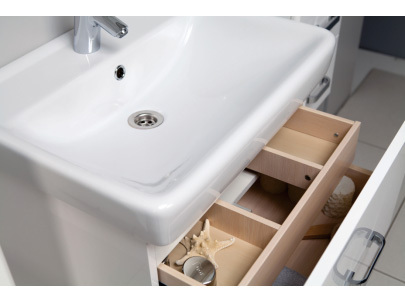 Комплектация: фаянсовая раковина "Тигода" 80 см (арт. 1WH302084), два внешних выдвижных ящика, скрытый ящик в верхнем отделении, комплект опорных ножек, доводчики. Корпус ЛДСП, фасады МДФ.