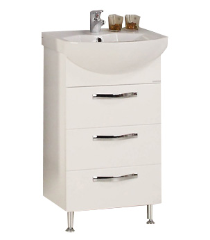 Комплектация: три выдвижных ящика с шариковыми направляющими, в верхнем ящике расположена система хранения. Корпус из глянцевого ЛДСП, фасады — МДФ (глянец), хромированая фурнитура, фаянсовая раковина "Смайл 50".