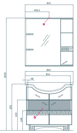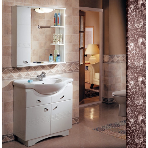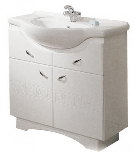 Комплектация: фаянсовая раковина "Акватель-85" (арт. 1WH110216), две распашные дверцы с орнаментом, ножки закрыты декоративной накладкой с тем же орнаментом, корпус из глянцевого ЛДСП, фасады — МДФ (глянец), хромированая фурнитура.