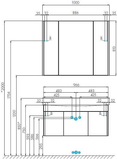 Комплектация: зеркальный шкаф, навес (2 шт.), ручка (3 шт.).