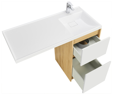 - Верхний ящик открывается с помощью системы push-to-open, а нижний - за фасад с помощью удобного выпила под углом.