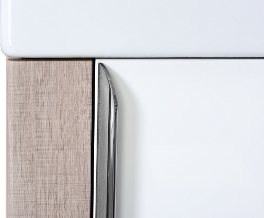 Тумба с раковиной Акватон Вита 45 - арт. 1A221401VTD70 / 1WH301972 - практичное и функциональное решение для небольших ванных комнат и санузлов, которое отличается сочетанием эффектного белого глянца и стильной отделки под дерево ясень шимо. Фасады и корпус тумбы выполнены из влагостойкой ЛДСП. Распашной фасад-створка открывается с помощью вертикально установленной ручки и оборудован петлями с интегрированной системой плавного закрывания, благодаря чему эксплуатация тумбы становится практически бесшумной.