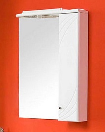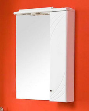 Комплектация: влагостойкое зеркальное полотно, справа закрытый шкафчик с изящной фрезеровкой на фасаде распашной дверцы и полочкой. В карниз встроены галогеновые светильники с автономным выключателем и розетка.