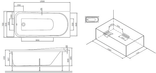 Модель отличается удобным эргономичным дизайном, который не только обеспечивает абсолютный комфорт водных процедур, но и увеличивают объём ванны благодаря ультратонким бортам, достигающий 155 литров. Глубина ванны составляет 43 сантиметра при высоте 60 сантиметров, соотношение длины и ширины – 150х70 см. По желанию в комплектацию могут быть добавлены каркас, слив-перелив и фронтальная панель.