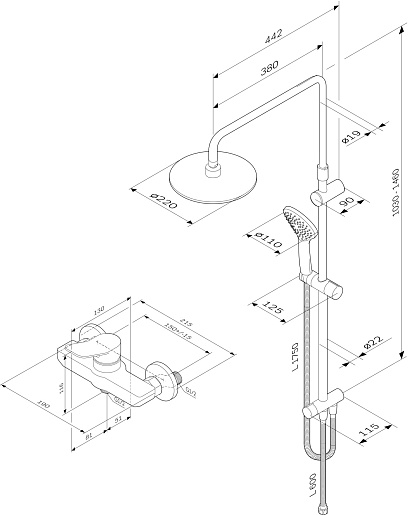Смеситель, лейка, шланг, штанга, верхний душ, крепление