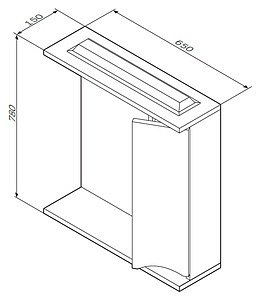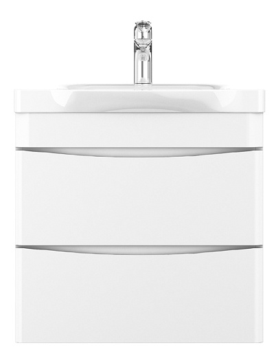 Подвесная тумба включает в себя две выдвижные полочки, предназначенные для хранения косметических или чистящих средств и инструментов. Высота верхней полочки – 245 миллиметров, нижней – 390 миллиметров. Габариты комплекта составляю 65х49х65 сантиметров. Корпус изготовлен из влагозащищённого ЛДСП, которому не страшны брызги, пар и частые перепады температур. Встроенная мебельная раковина – керамическая.
