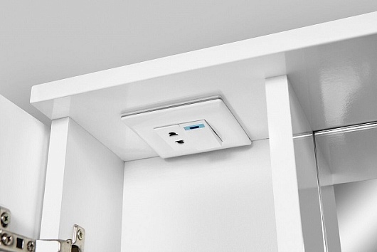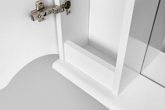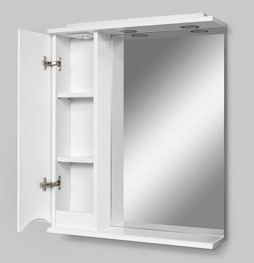 Описание: влагостойкое зеркальное полотно, шкафчик, полочка, выключатель, розетка, дверь с доводчиками, подсветка.