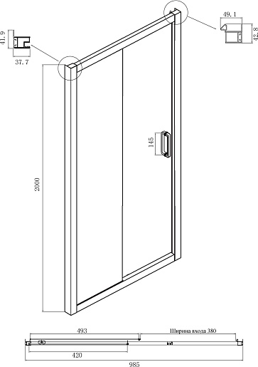 - Дверь: одна раздвижная дверь, одно неподвижное стекло.