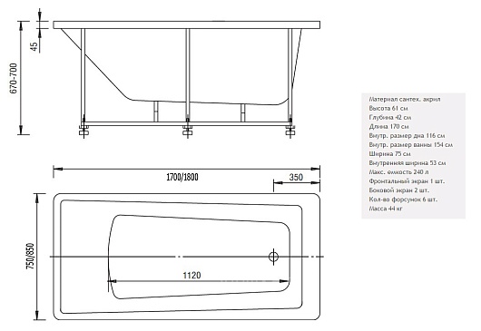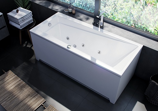 Комплектация: ванна, каркас, фронтальный экран, гидромассажная система (6 форсунок), слив-перелив.