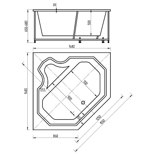 Комплектация: ванна, каркас, фронтальный экран, гидромассажная система (6 форсунок), слив-перелив.