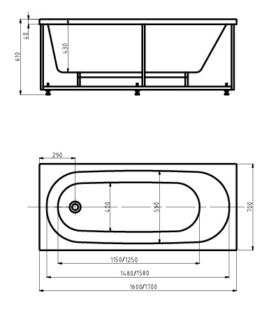 Комплектация: ванна, каркас, фронтальный экран, гидромассажная система (6 форсунок), слив-перелив.