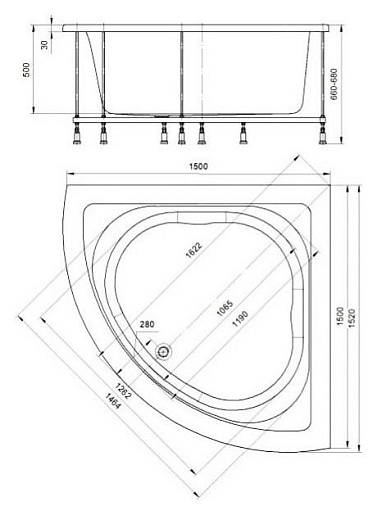 Комплектация: ванна, каркас, фронтальный экран, гидромассажная система (8 форсунок), слив-перелив.
