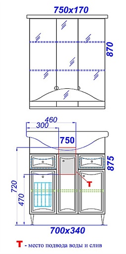 Описание: тумба на хромированых ножках, с раковиной (Стиль 75), с бельевой корзиной, ящиками и секциями для хранения.