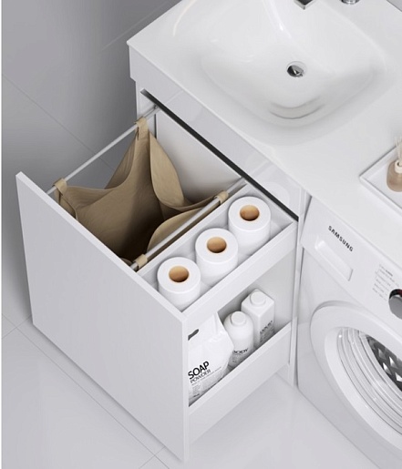 - Напольная тумба Forma, бельевая корзина слева и два отсека для хранения хозяйственных принадлежностей..