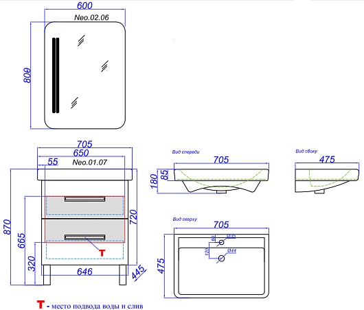 - тумба под раковину: 2 выдвижных ящика с ручками, ножки