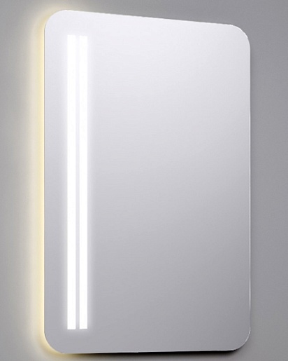 Описание: Влагостойкое зеркало с серебряной амальгамой со скругленными углами. Две полосы холодной абразивной обработки (пескоструя) и встроенной люминесцентной подсветкой с эффектом фонового освещения