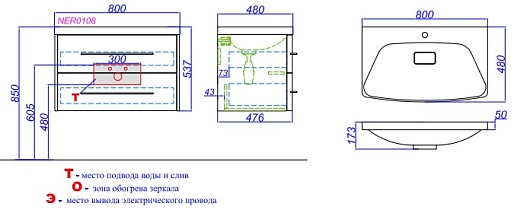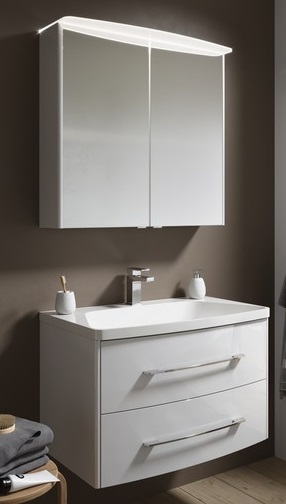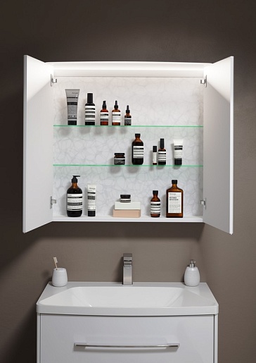 - Зеркальный шкаф с двумя дверьми, светодиодным светильником, также освещающим внутреннее пространство, сенсорным выключателем и регулятором освещенности.